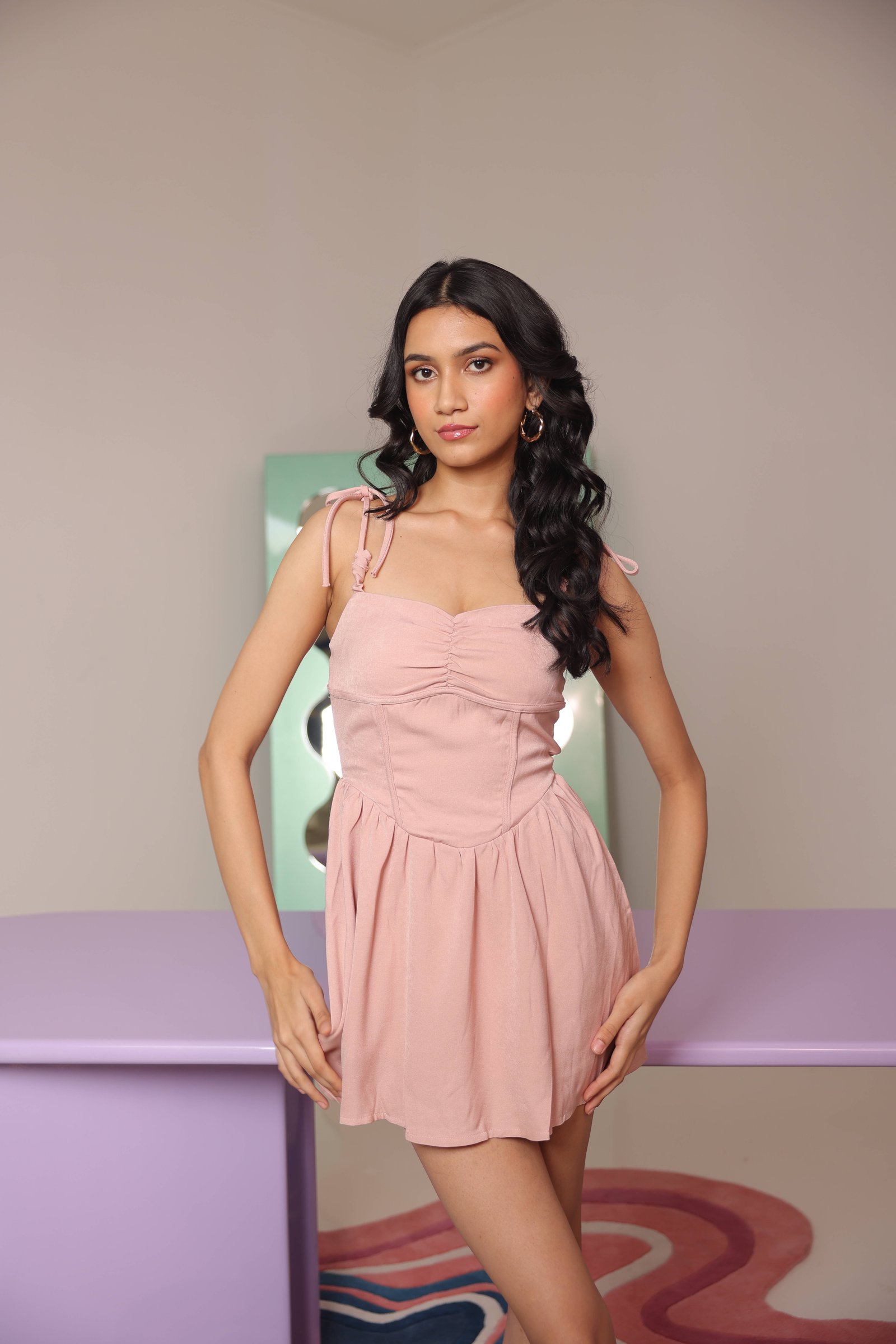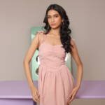 – Features: Boning details, tie-yourself straps, ruched bust, pleated skirt