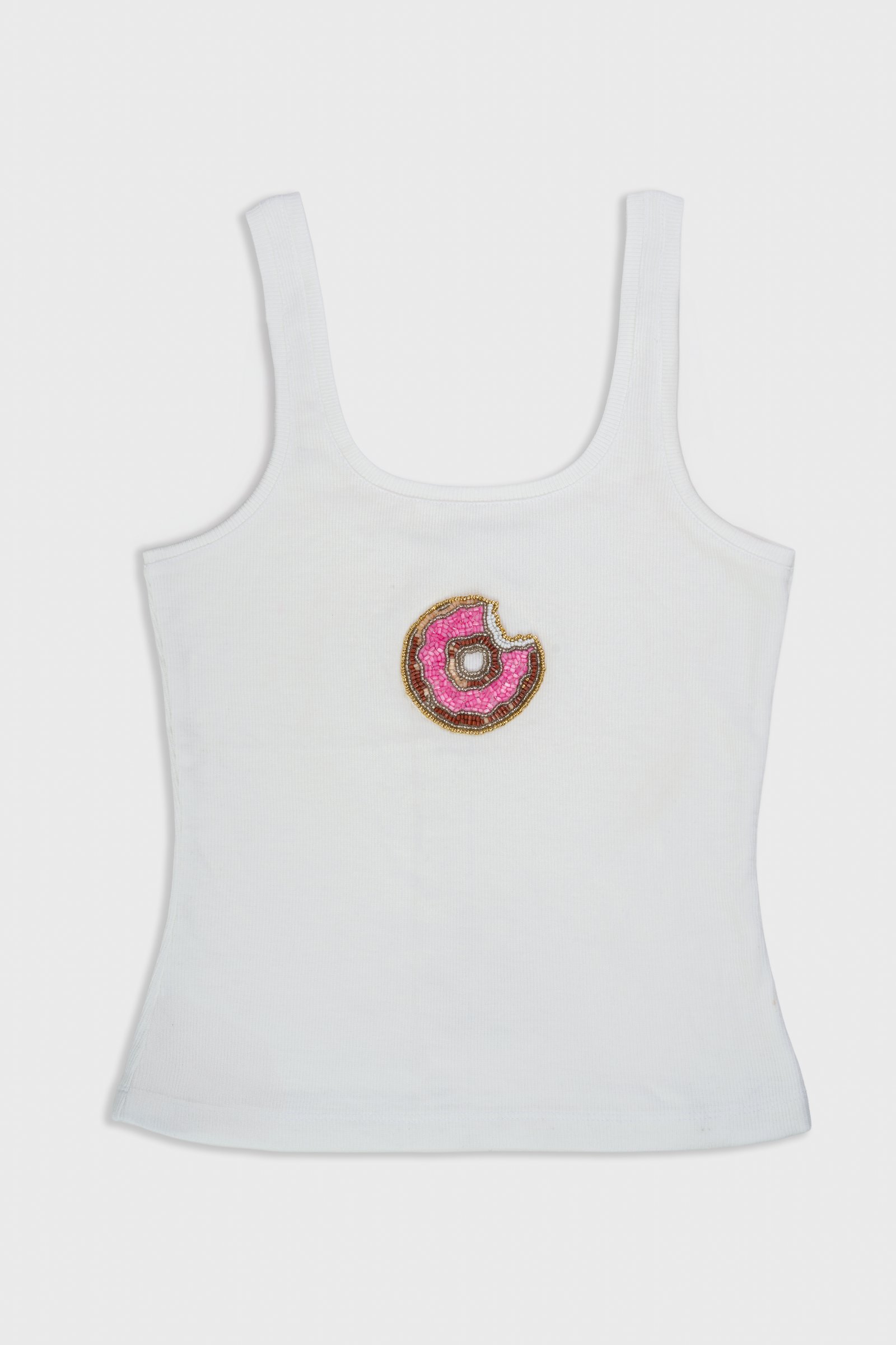 HomeShopTopsTANK TOP DONUTTANK TOP DONUT Delivery time: 5-7 days. More InfoSize ChartsSize Chart Guaranteed safe checkout Need Help? Call Us +91 9599433747 Description Description Embellished motif on a cotton ribbed tank top